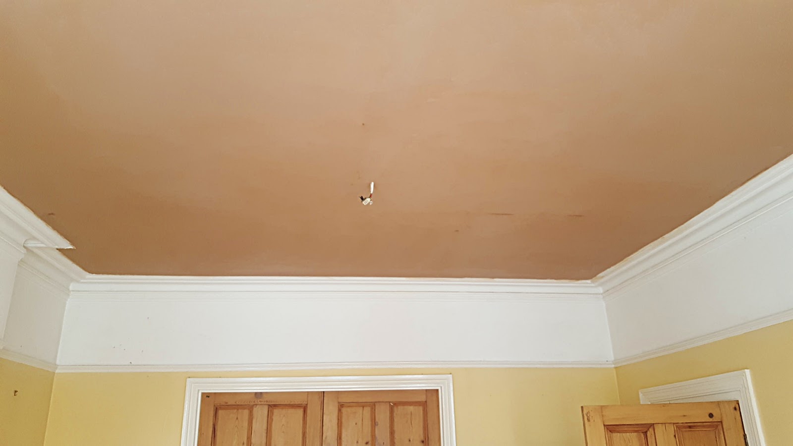The damaged original plaster ceiling has been removed, exposing the wooden lathes. 12.5mm sheets of plasterboard was then fitted to the wooden beams. This new ceiling was then plastered using 2 layers of multi-finish plaster.